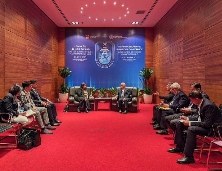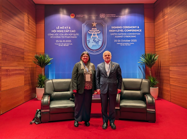 Hanói, 25 de octubre de 2025.– La viceministra para Asia, Medio Oriente y Oceanía de la República Bolivariana de Venezuela, Tatiana Pugh Moreno, sostuvo una reunión bilateral con el viceministro de Asuntos Consulares, Parlamentarios e Iraníes de la República Islámica de Irán, Vahid Jalalzadeh, en el marco de la Ceremonia de la Firma de la Convención de las Naciones Unidas para la Ciberdelincuencia, efectuada en Hanói, capital de la República Socialista de Vietnam.
