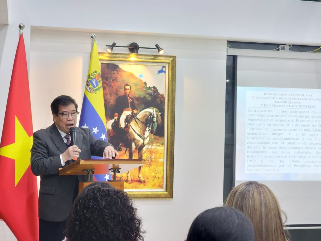 Hanói, 3 de febrero de 2026.- La Misión Diplomática de Venezuela en Vietnam realizó un encuentro de solidaridad al cumplirse un mes de la invasión militar de Estados Unidos (EEUU) contra su país, hecho que derivó en el secuestro del Presidente Constitucional Nicolás Maduro y de la Primera Dama, diputada Cilia Flores.